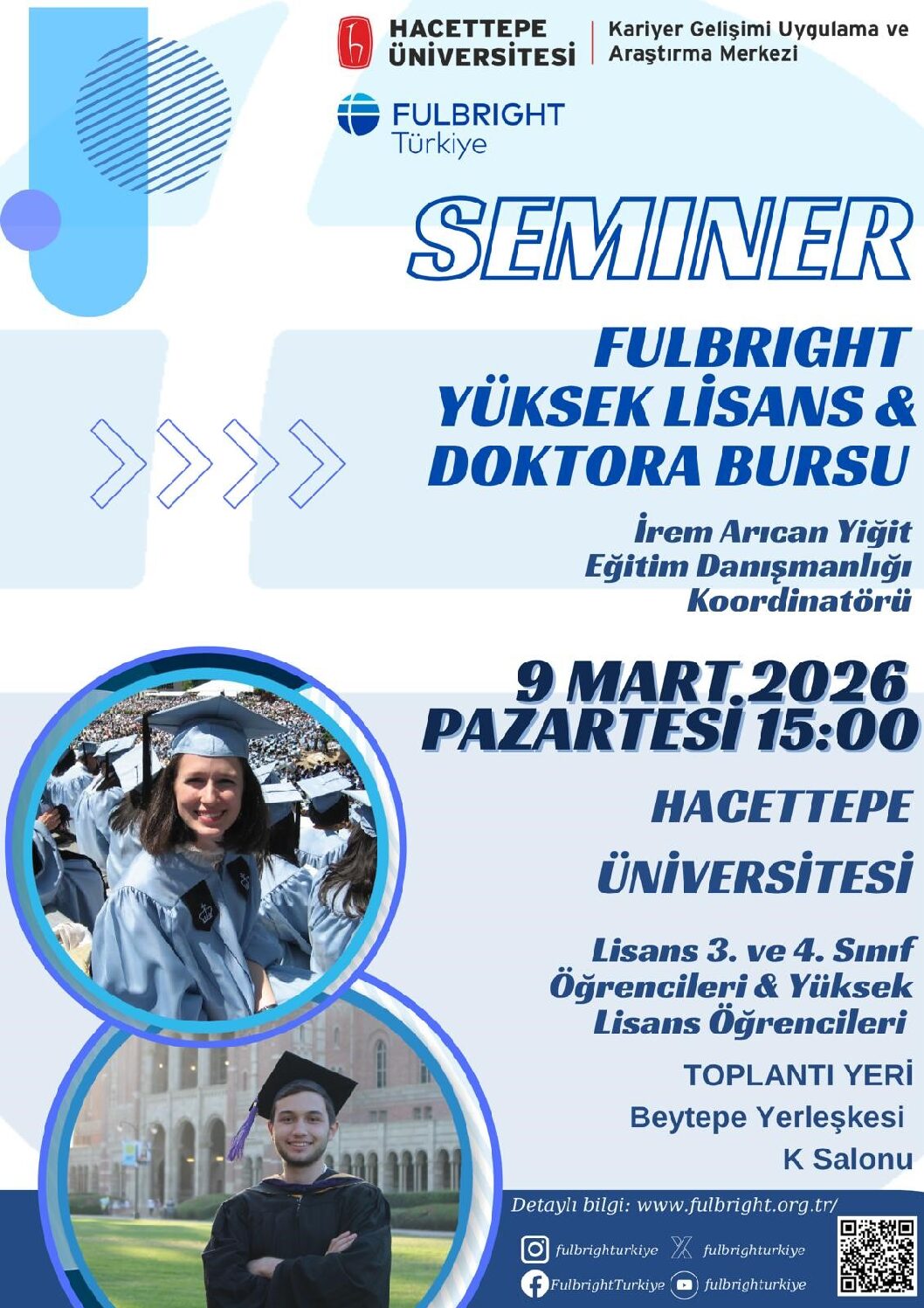 Türkiye FULBRİGHT Eğitim Komisyonu Eğitim Danışmanlığı Koordinatörü İrem Arıcan Yiğit tarafından FULBRİGHT Yüksek Lisans ve Doktora bursu hakkında; bursların başvuru koşulları, başvuru belgeleri, başvuruda yazılması gereken kompozisyonlar, tüm başvuru ve değerlendirme süreci ve bursun kapsamı başlıklı bir seminer gerçekleştirilmiştir.